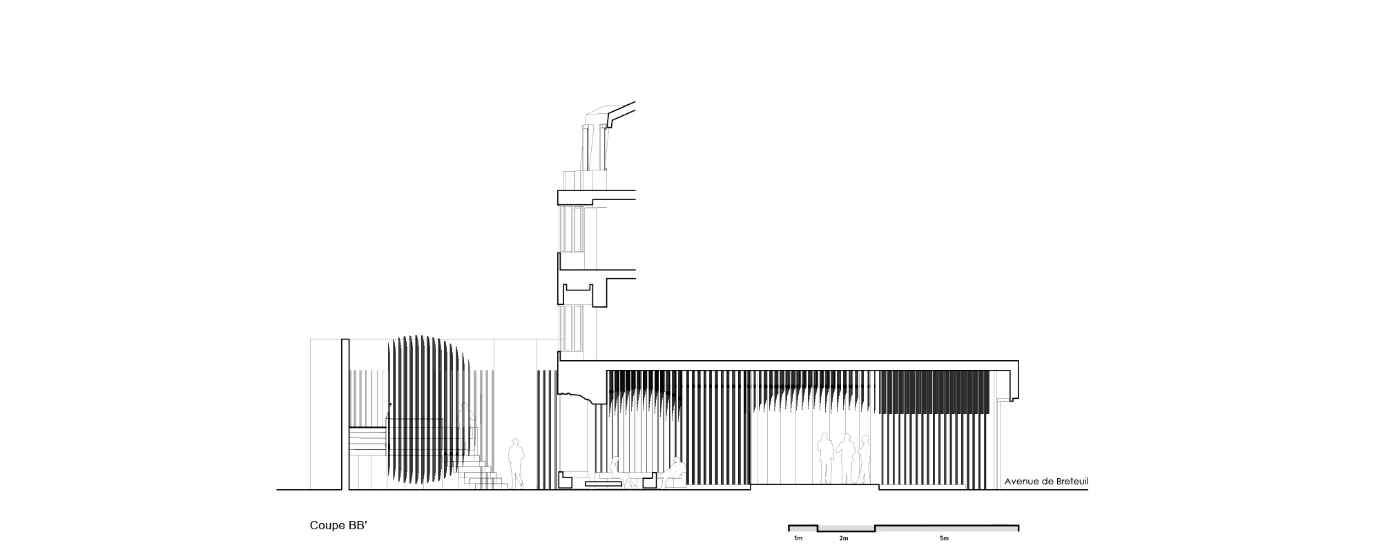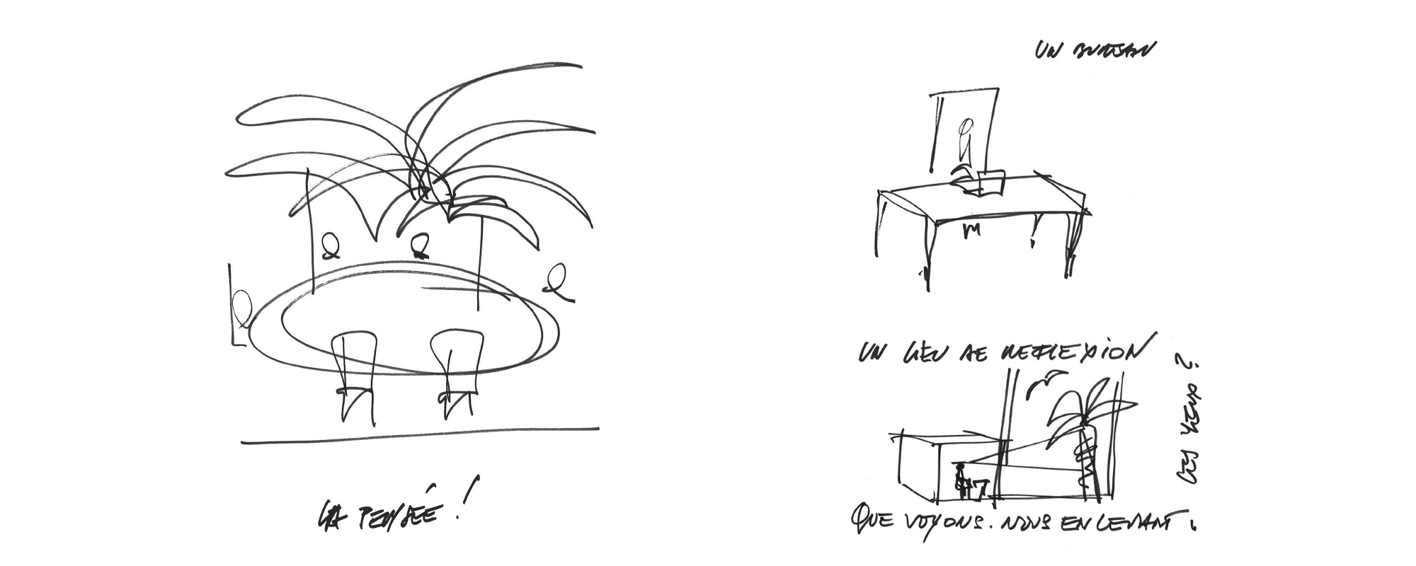 Nous avons choisi de créer « un seuil » en continuité avec l’hémicycle existant qui marque la nouvelle entrée des locaux. Dans l’alignement, nous avons installé un salon à la jonction avec la cour réaménagée en jardin. Cet espace est situé dans un lieu éclairé naturellement avec une vue « privilégiée » sur l’élément « sculptural » qui signe l’entrée créant une identité visuelle forte. Le lieu s’inscrit dans la continuité du traitement de l’entrée composé de plans successifs, tout en créant le lien intérieur/extérieur. L’élément fédérateur de l’ensemble de ces atmosphères séquencées est matérialisé par un volume de tiges métalliques suggérant la prolifération et la ramification (métaphore de l’identité du groupe), permettant d’accueillir et de guider le visiteur par l’encombrement de l’espace.